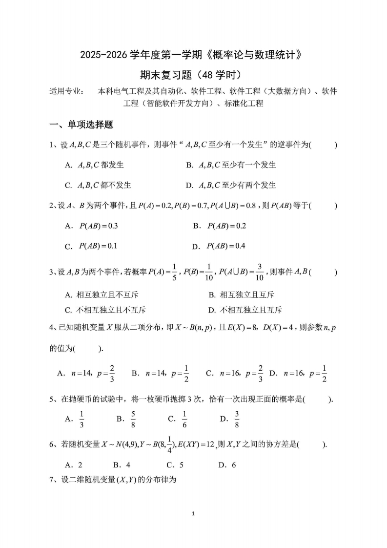 首页学科资料理工类数学《概率论与数理统计》复习测试题(不含答案)