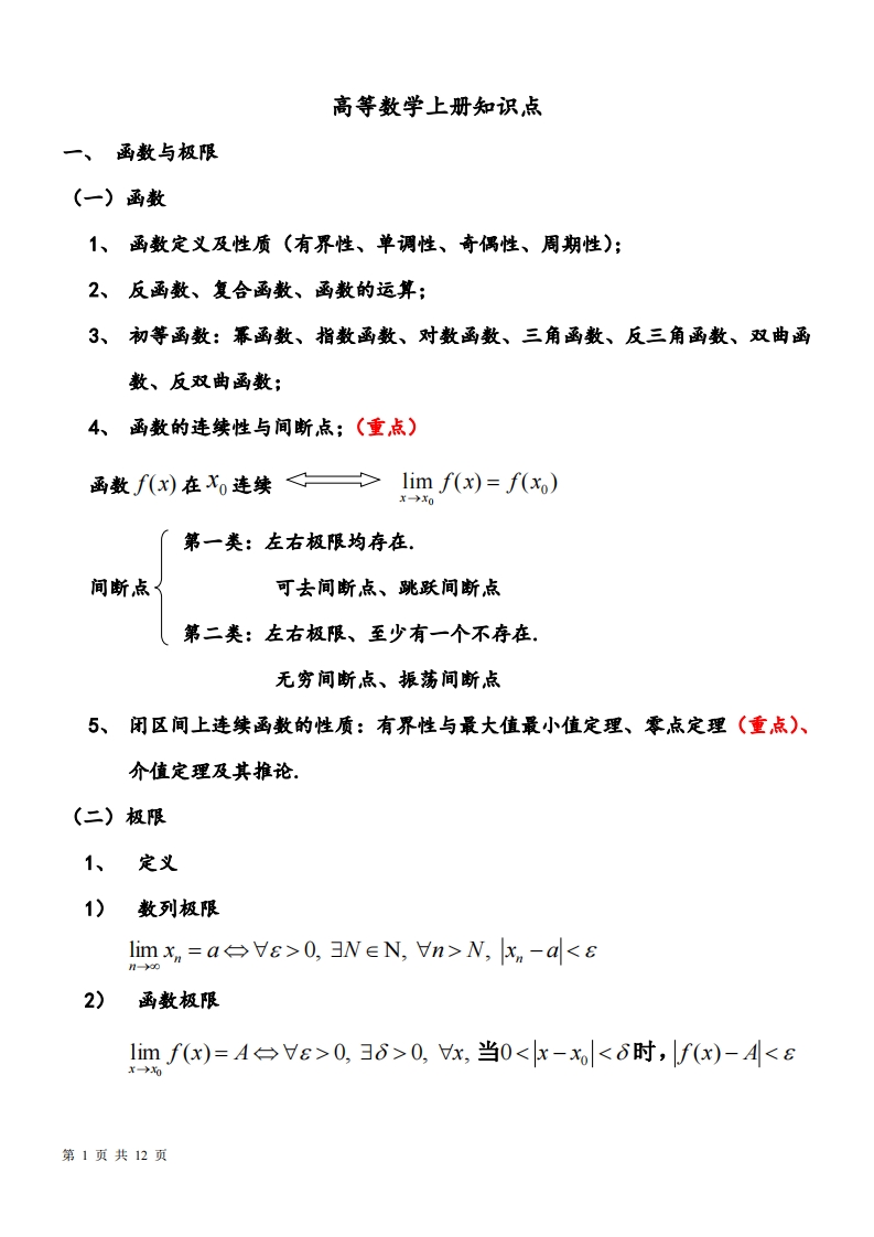 《高等数学》上册复习知识点